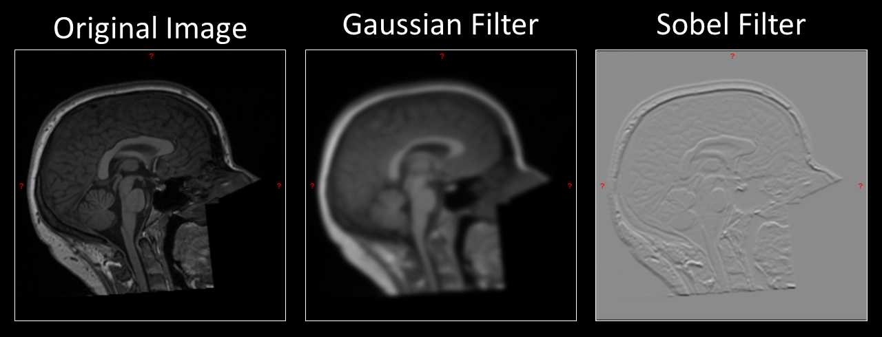 Fig. 4 Example of both a Gaussian and Sobel filter applied to an anatomical MR image. In both cases, the filter makes the image look subjectively worse. However, useful properties of the signal that underlies the image have been enhanced in each example.#