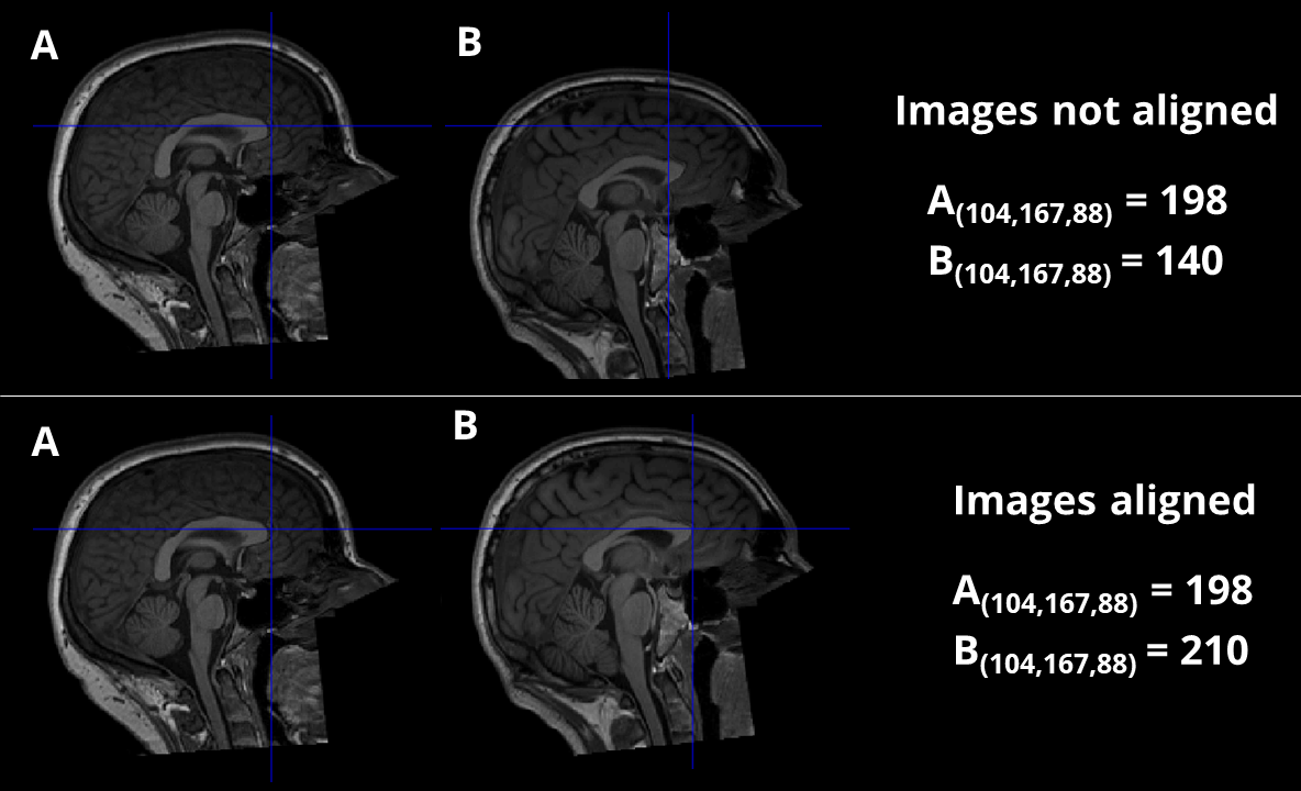 Fig. 3 Illustration of how the same coordinates across two images are meaningless unless there is anatomical alignment between them. In the top row, the images are not aligned and thus the voxel values derived from the same coordinates are not useful because they correspond to different anatomical regions. In the bottom row, the images are aligned and thus voxel values from the same coordinates can be meaningfully compared.#